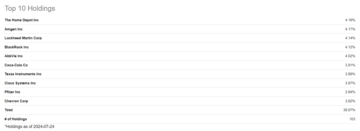 W skład SCHD wchodzi obecnie 103 firm. Część z nich stanowi marginalny udział. Warto zaznaczyć, że prawie 40% portfela stanowi tylko dziesięć spółek. Fundusz wybiera podmioty, które nie tylko oferują wysokie dywidendy, ale także mają silne bilanse, niskie zadłużenie i stabilne przepływy pieniężne. Taka selekcja gwarantuje, że inwestycje są dokonywane w zdrowe finansowo podmioty, co zwiększa szanse na stabilne i rosnące dywidendy w przyszłości.