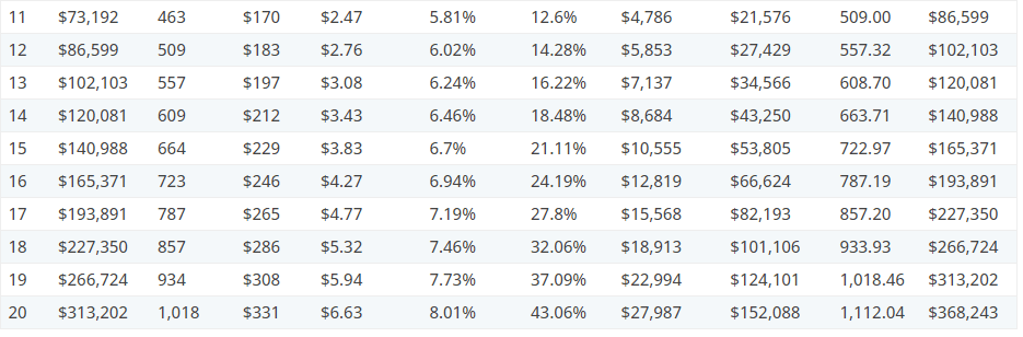 Dalej dopłacamy jedynie 250 dolarów miesięcznie, co rocznie daje 3000 USD nowego kapitału. Z dywidend za rok 10 wpłynęło 3899 USD. Mamy z tego wartość 6899 USD a różnica między 11 a 10 rokiem w wartości portfela wynosi już prawie 13 5000 USD. Innymi słowy procent składany dorzucił nam drugie tyle kapitału. Sam z siebie. Nie chce rozbudzać wyobraźni, ale wykonaj podobne działanie na latach 20 i 19. Pamiętaj, niczego nie zmienialiśmy w założeniach. Dalej dopłaciłeś 3000 USD z własnej kieszeni.
