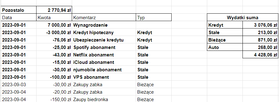 Jak widzisz stawiam przede wszystkim na prostotę. Plik mam dostępny z poziomu komputera i telefonu dzięki czemu po wyrobieniu w sobie nawyku regularności każdy wydatek, lub inaczej wartość z minusem jest tego samego dnia wprowadzana do arkusza. Nie rozbijam paragonu na czynniki pierwsze, staram się zachować zdrowy rozsądek w tym wszystkim. Obok dodatkowo jest tabela z sumowaniem na podstawie której mogę porównywać przepływy względem innych miesięcy i kontrolować ich wysokość. Użyłem prostych formuł i po dodaniu nowego wiersza danego typu wartości są aktualizowane. Z doświadczenia wiem, że najlepszym polem do szybkiego ucięcia zbędnych wydatków są różnego rodzaju subskrypcje i abonamenty. W kilka miesięcy udało mi się zmniejszyć ich udział o połowę. Nie zauważyłem przy tym obniżenia komfortu życia.