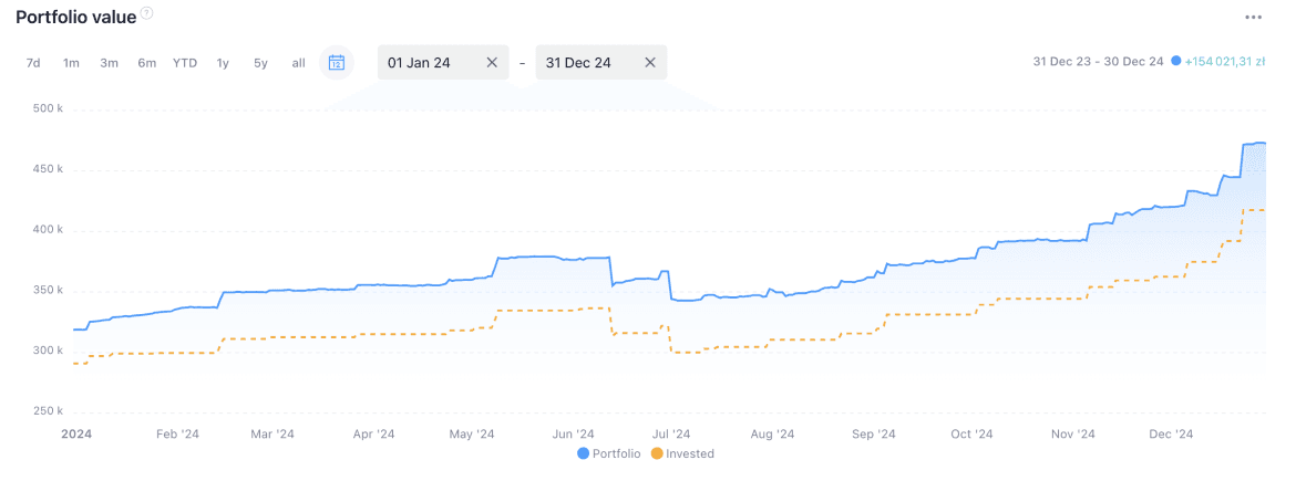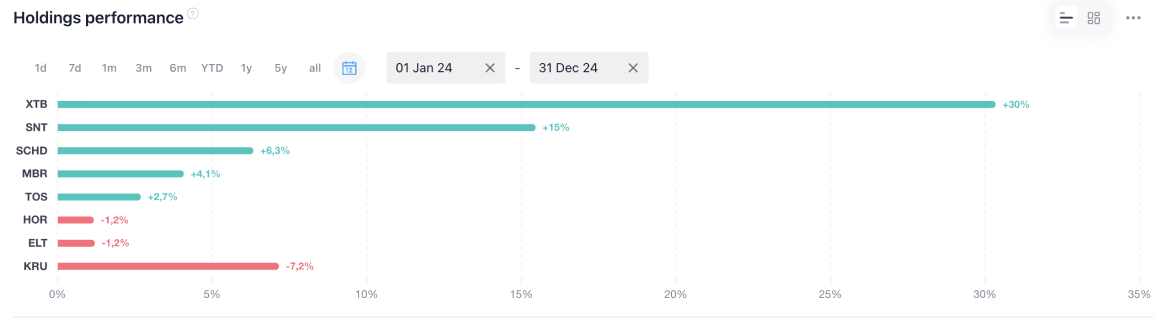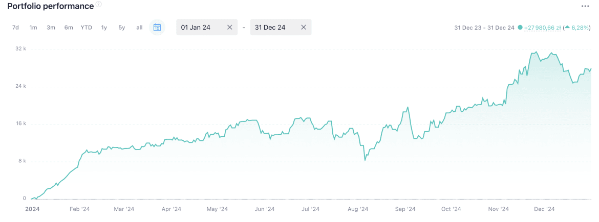 Niekwestionowanym koniem pociągowym portfela w 2024 roku była spółka XTB. Dynamiczny rozwój, wyraźny napływ nowych klientów i zyski rozgrzały inwestorów co doprowadziło do szybkiego wzrostu kursu. W trakcie roku uśredniałem zakup w górę. W ostatnich miesiącach do wyścigu włączył się także Synektik będący wyraźnie na fali – sprzedaż robotów DaVinci wystrzeliła. Potencjał na kolejny rok pozostaje równie wysoki.