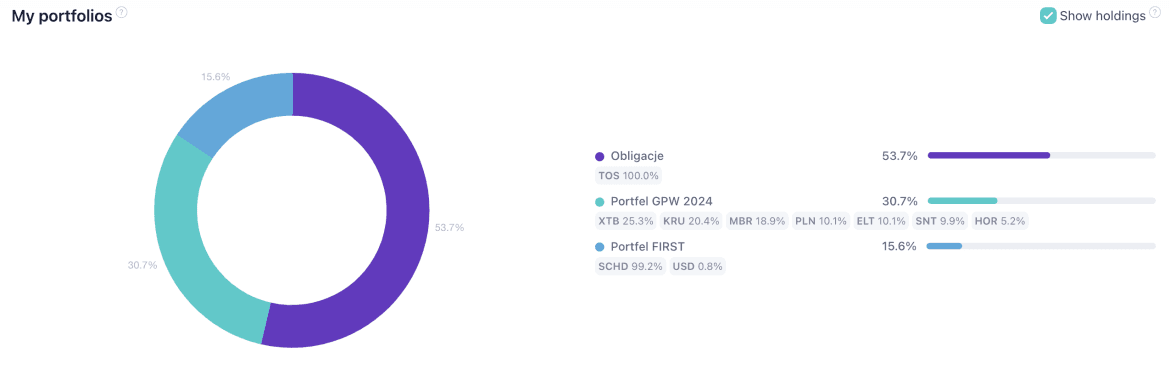 Koszyk akcji to kilka spółek z GPW, większość z nich przechowywana na rachunkach IKE oraz IKZE. Niewielka część pozostaje na zwykłym rachunku. To papiery kupione jeszcze w 2023 roku i na ten moment nie czuję potrzeby ich sprzedaży, a przenosić do IKE się nie opłaca. Całość uzupełnia amerykański ETF na dobre spółki dywidendowe o tickerze SCHD wypłacający ponad trzyprocentową dywidendę. Jego wielkość to obecnie około 15% wartości portfela emerytalnego.