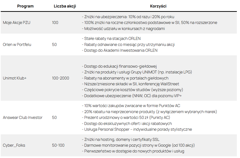 - Posiadacze minimum 50 akcji mogą uzyskać do 10% zniżki na wybrane produkty i usługi.